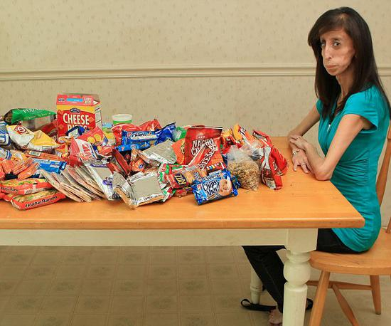 那些节食饿身材的模特们会得厌食症,而丽兹恰恰相反,嗜各种高热量食物如命:脆饼、糖果、巧克力、披萨、鸡肉、蛋糕、甜甜圈、冰淇淋、夹心饼干……